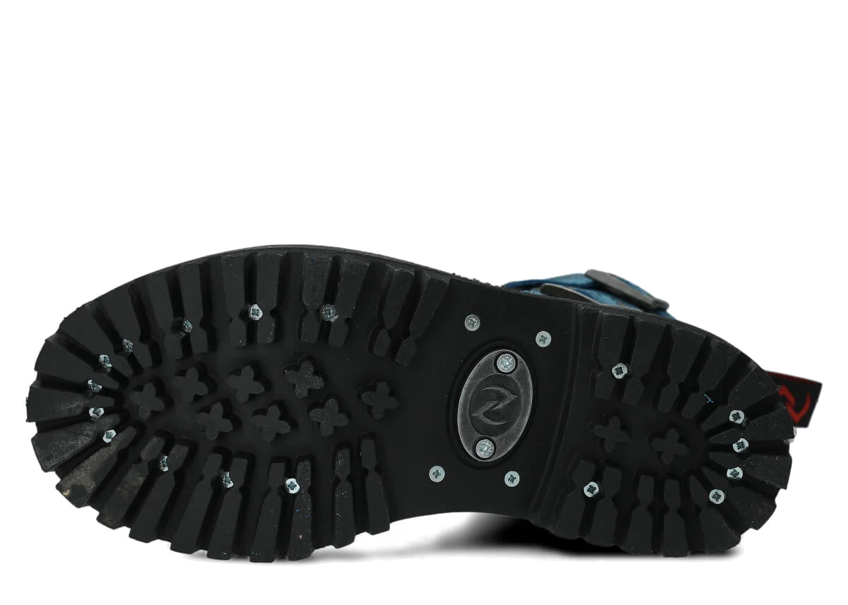 The non-slip sole made of genuine rubber is adorned with decorative screws and a characteristic metal logo, giving the boots a unique character.