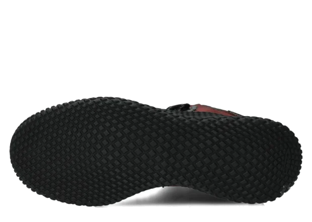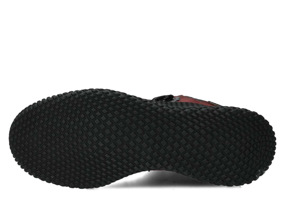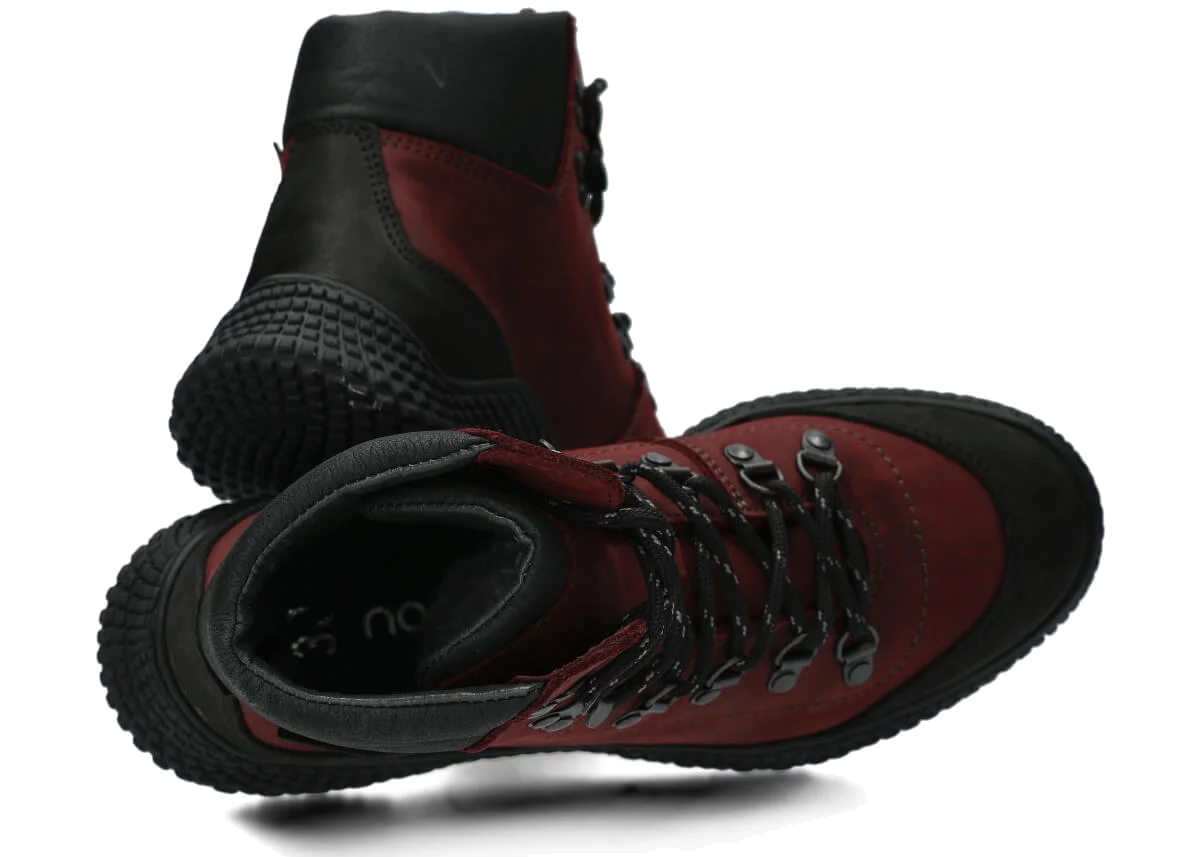 The upper combines two types of crazy leather, with dominant burgundy natural crazy leather paired with black accents on the toe, heel, and collar, creating a distinctive urban-outdoor appearance. The thick, sturdy, oiled leather with natural marks, abrasions, and scratches ensures each pair feels unique.