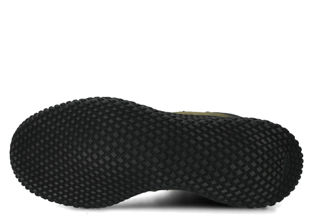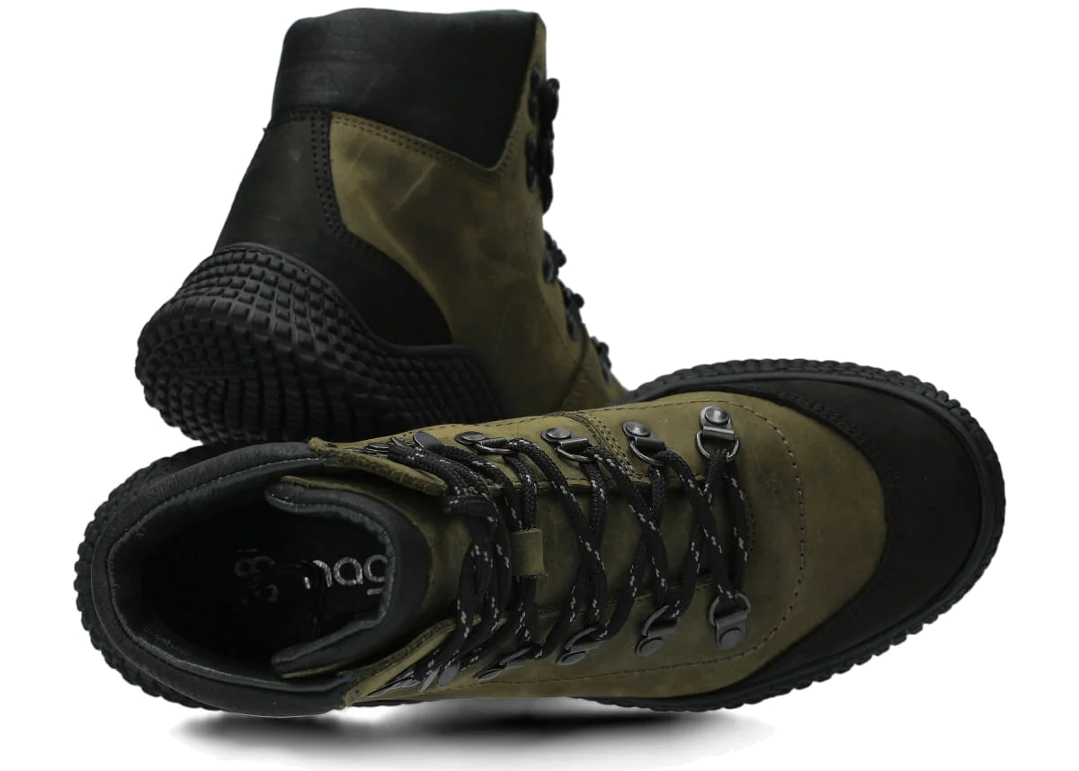 The upper combines two types of crazy leather, with dominant olive green natural crazy leather paired with black accents on the toe, heel, and collar, creating a distinctive urban-outdoor appearance. The thick, sturdy, oiled leather with natural marks, abrasions, and scratches ensures each pair feels unique.